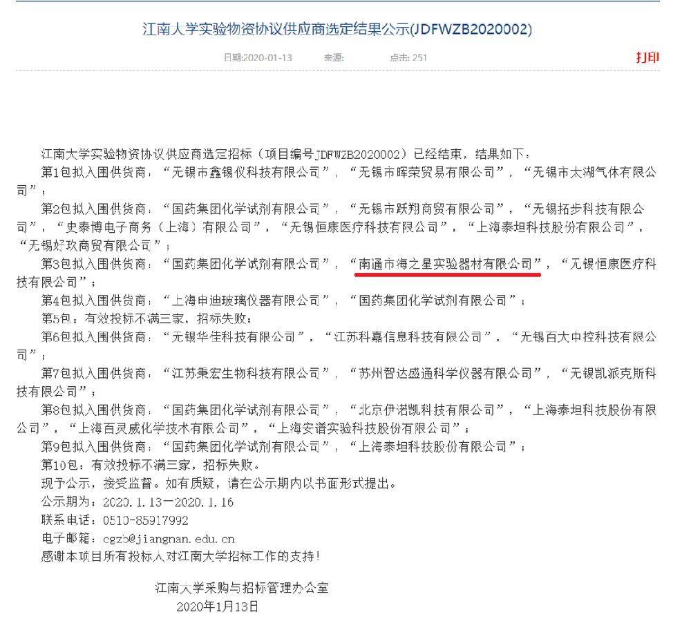 江南大學實驗物資協(xié)議供應商選定結果公示(JDFWZB2020002)